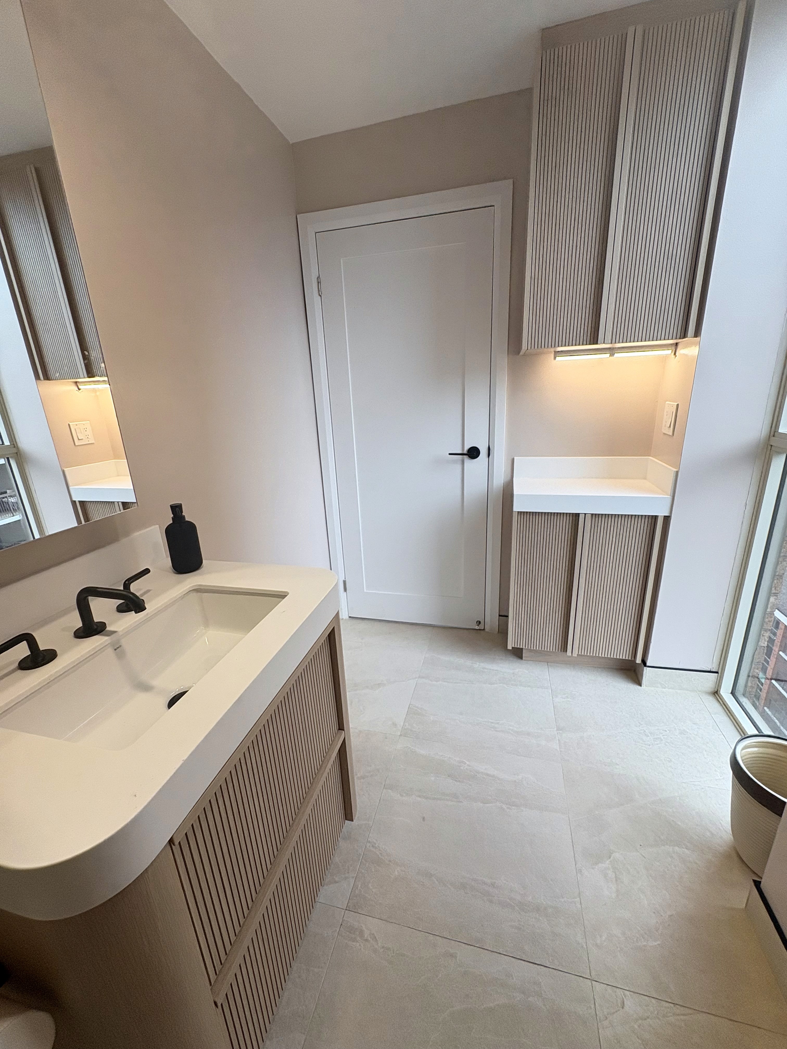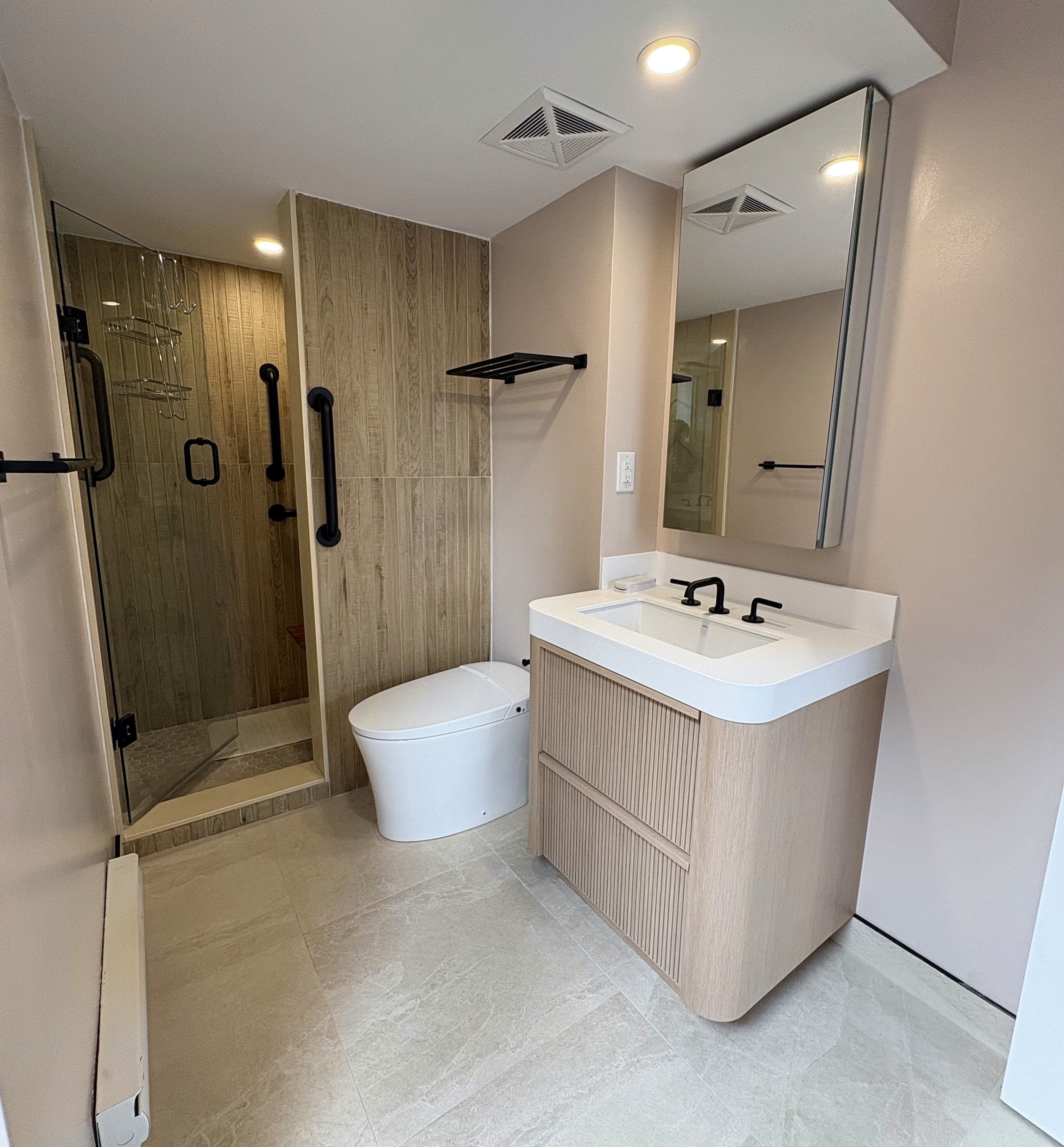 This Bloor-Yonge bathroom renovation was designed to combine modern aesthetics with enhanced accessibility and everyday functionality. The original space was outdated and lacked the features needed for safe, comfortable use.