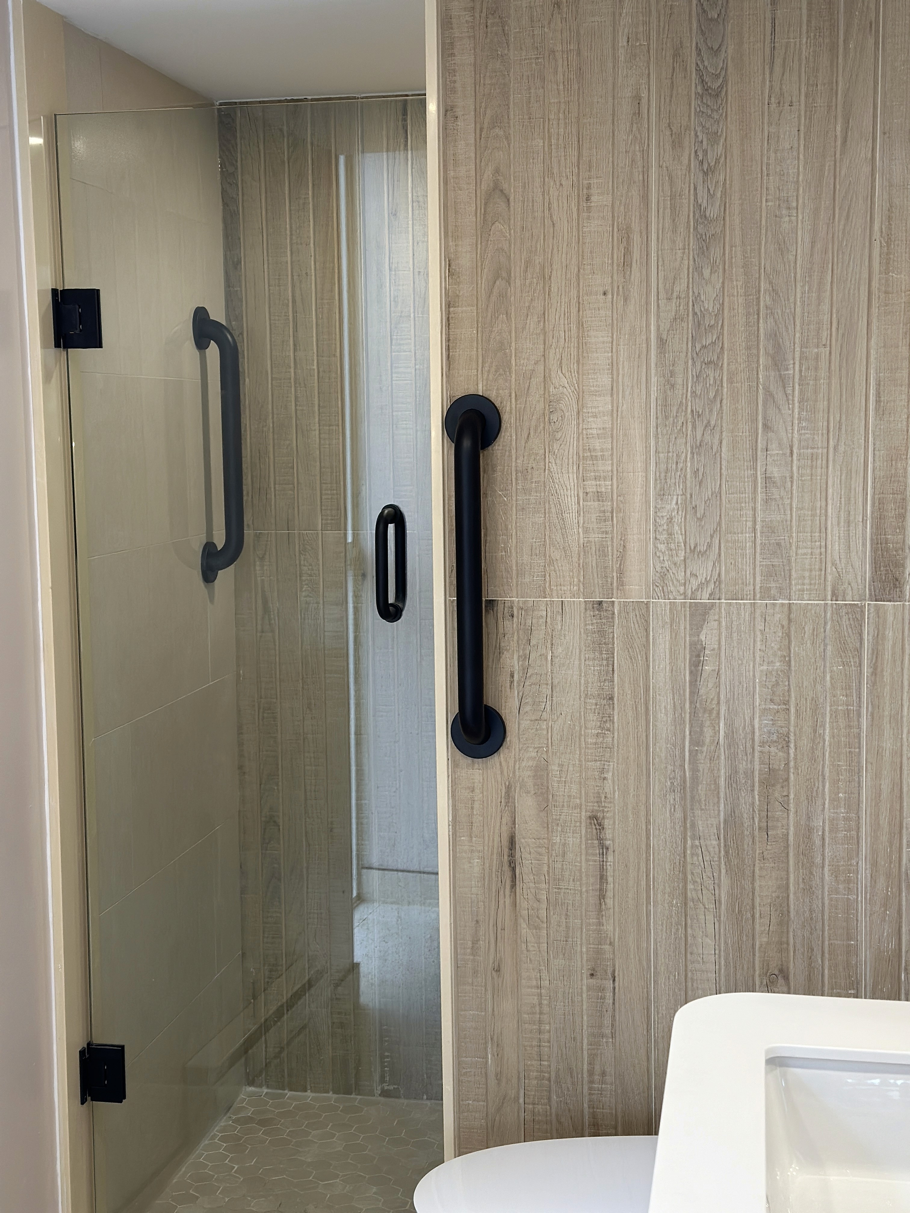 We transformed the layout into a clean, walk-in shower design with integrated grab bars, a built-in bench, and improved accessibility throughout. Warm wood textures were paired with neutral tones and matte black fixtures to create a space that feels both contemporary and inviting.