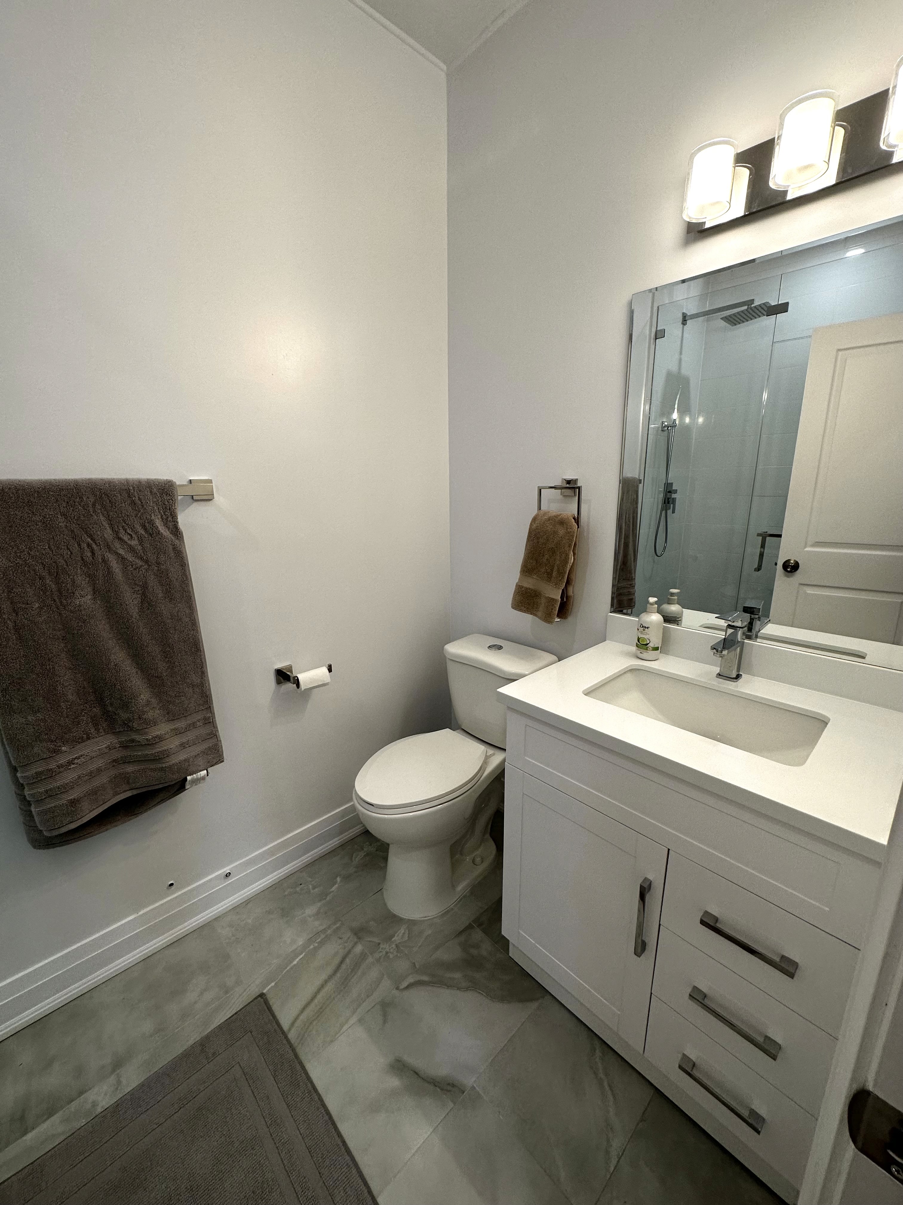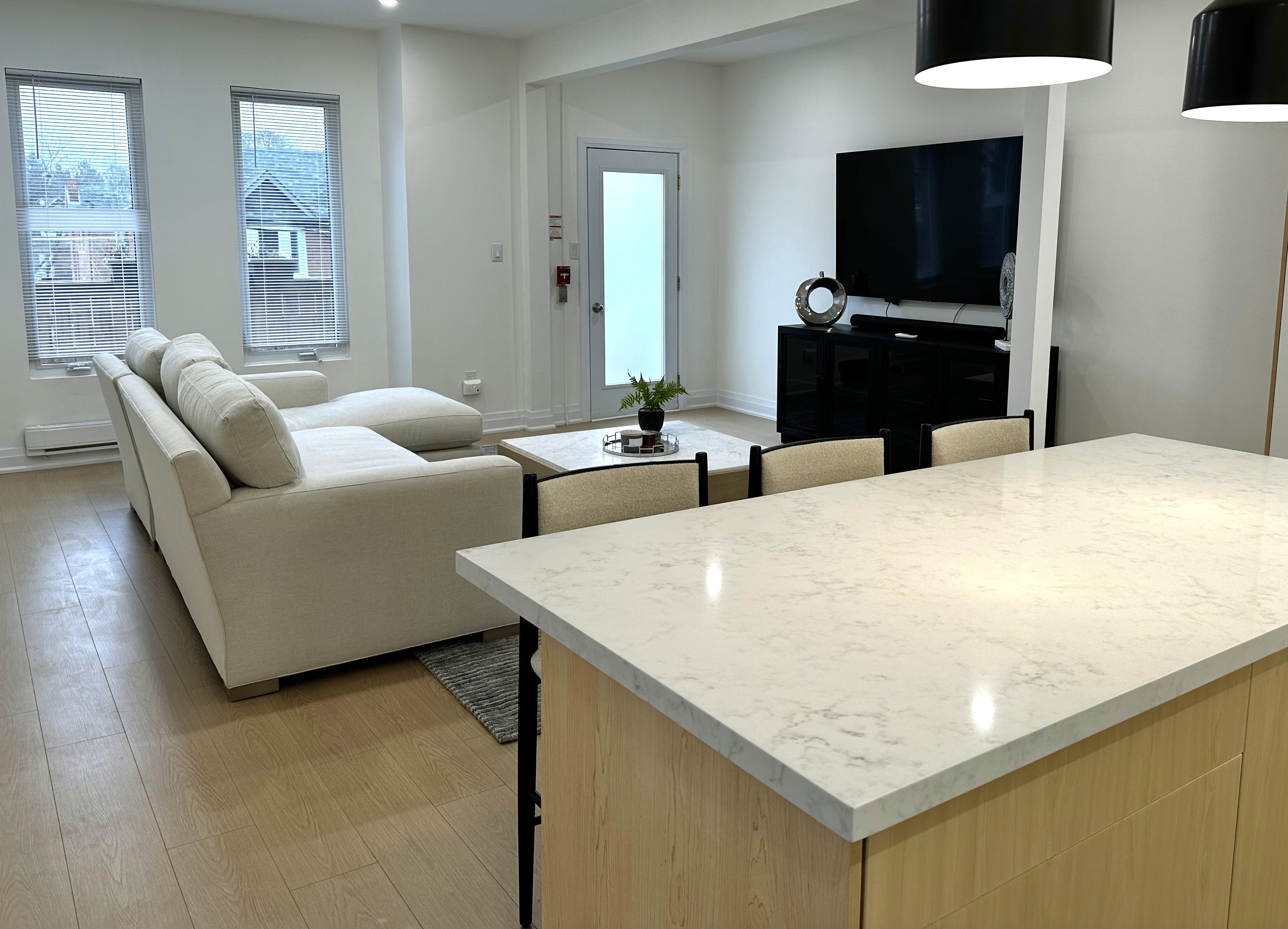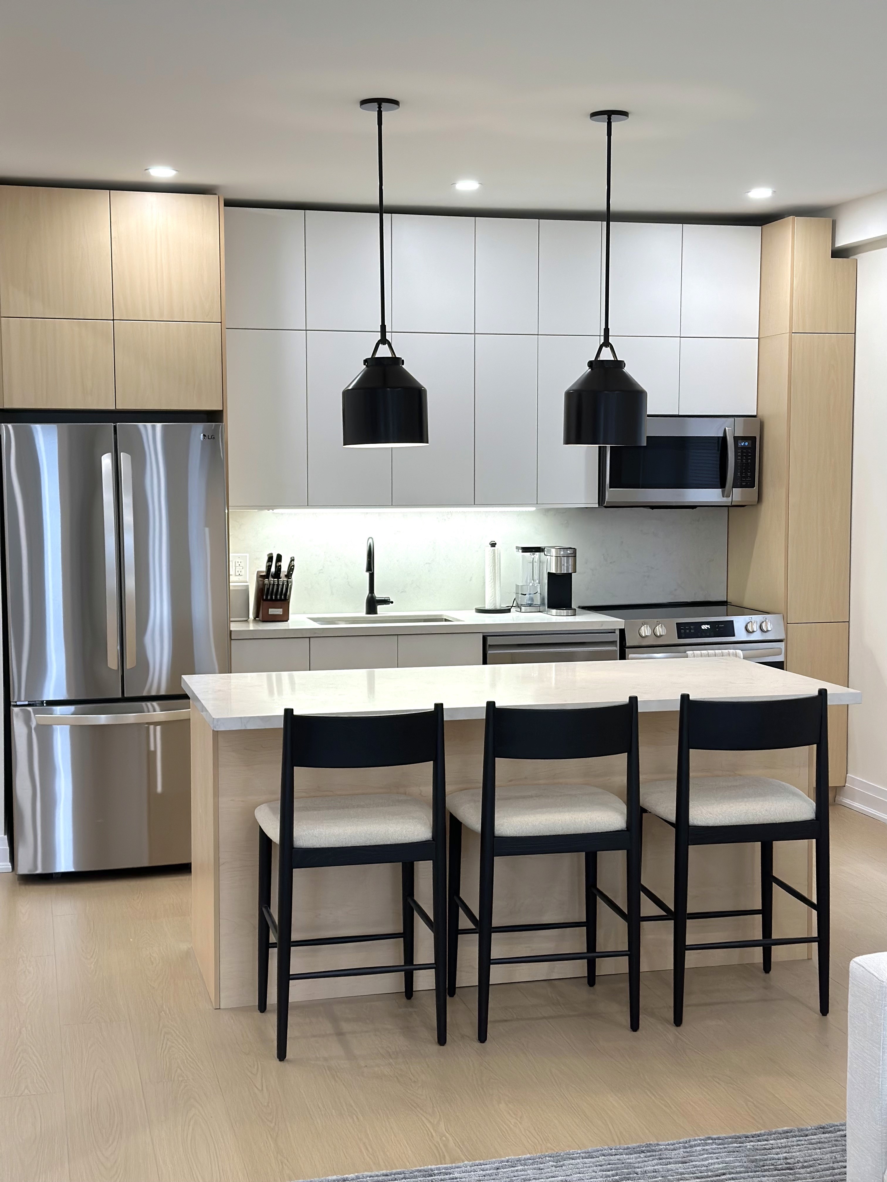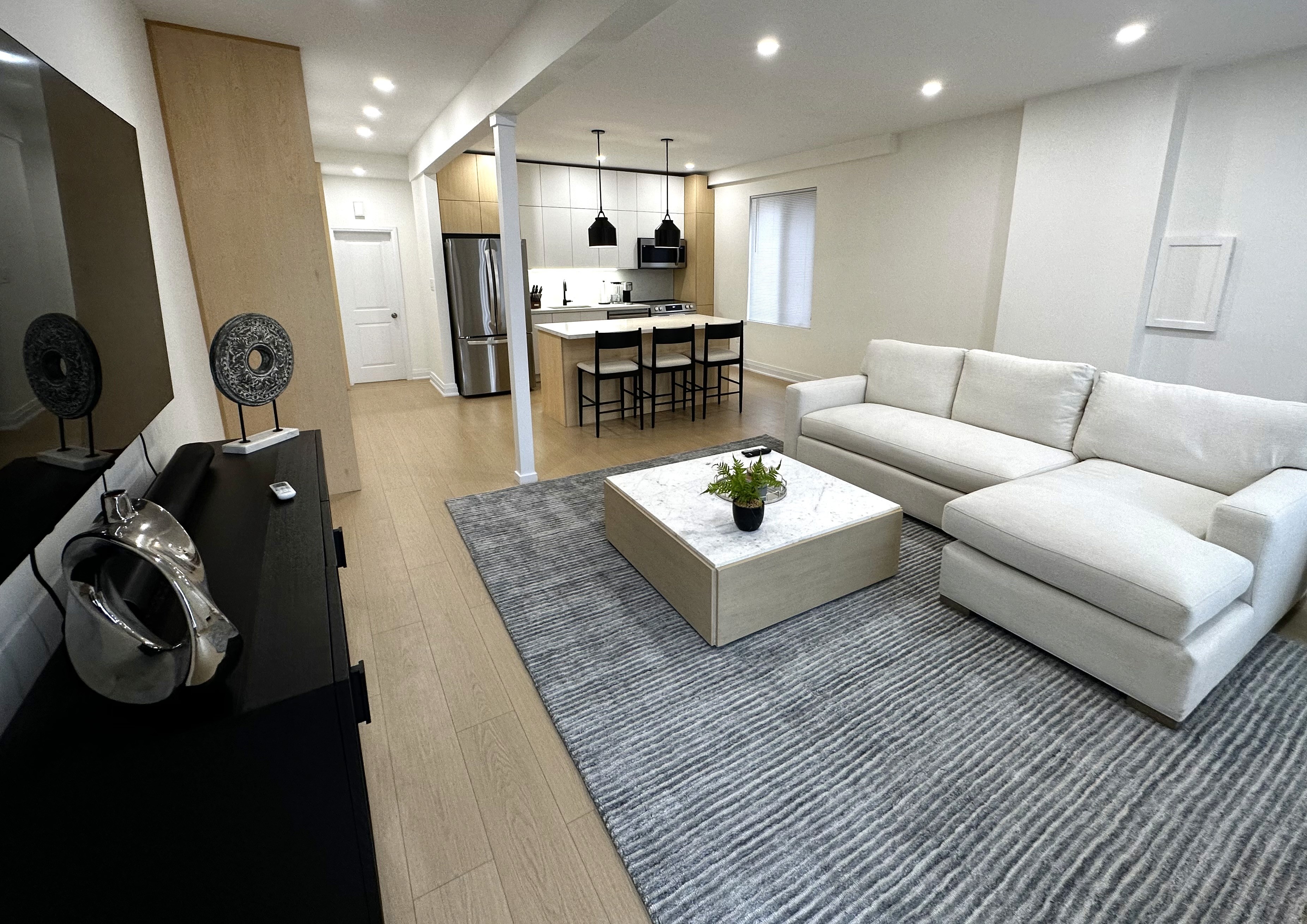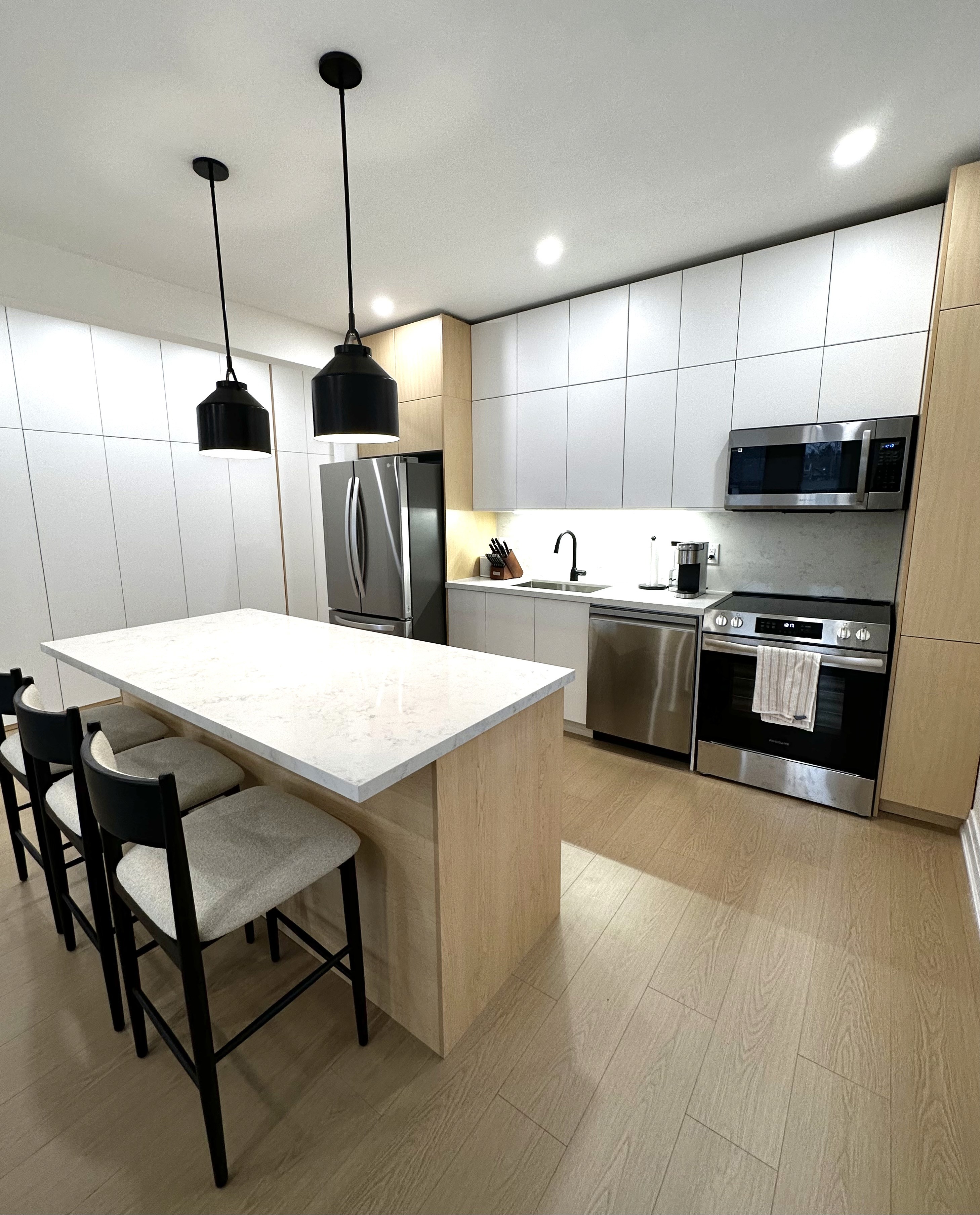 • Kitchen renovation with custom cabinetry and island • Added built-in storage and cabinetry for increased functionality • Full bathroom renovation with walk-in shower and tile work • Quartz countertops and backsplash installation • Electrical and lighting upgrades (pot lights & fixtures) • New flooring throughout main living areas • Staircase refinishing with new carpet installation • Interior painting and finishing